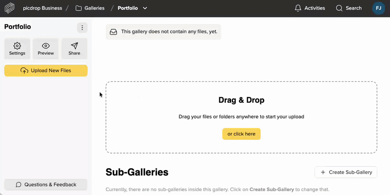 To upload folders, simply drag and drop them into a gallery or select “Upload new files” → “Upload Folder”. 📂